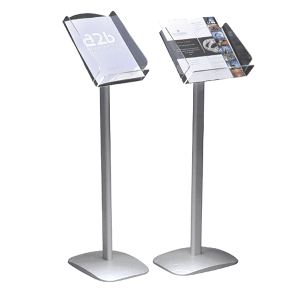 Stilfullt broschyrställ i aluminium med tung fot och broschyrfack av stark polycarbonat. Finns både med stående och liggande broschyrfack. Hög kvalitet i stilren design. Säljes som stående resp. liggande A3 samt A4.